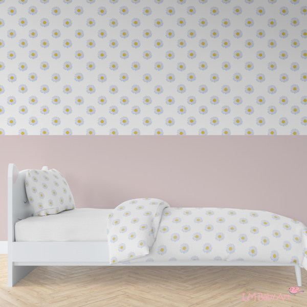 Dit vrolijke behang met een patroon van madeliefjes brengt vrolijke sfeer naar de babykamer. Als je net zo dol bent op madeliefjes als wij, dan is het madeliefjes behang perfect voor de inrichting van de kinderkamer. Het geeft de ruimte een zomerse uitstraling en het past ook zeker in een echte meidenkamer! Stijl het af met één van de kinderkamer items uit de collectie madelief.