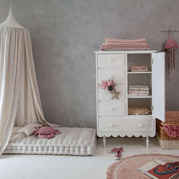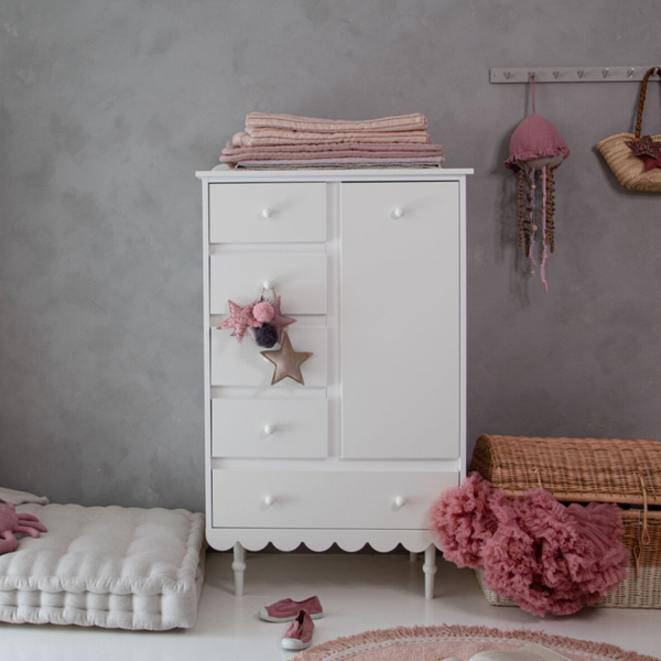 De Woodluck Babushka meidenkast is een charmante en ruime ladekast in retrostijl, perfect voor de babykamer en ideaal voor ouders die op zoek zijn naar praktische opbergruimte voor de kinderkamer. Deze kast, onderdeel van de unieke Babushka-collectie, straalt een romantische sfeer uit met zijn warm wit (Ral 9010) kleur.