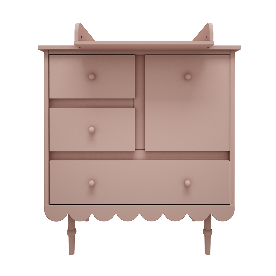 Deze roze commode heeft een optionele verzorgingsplank die bovenop geplaatst kan worden, zodat je je kindje gemakkelijk en veilig kunt verschonen. De plank heeft afgeronde hoeken en beschermt tegen vallen, en meet 9 cm hoog, 54 cm breed en 75 cm diep.